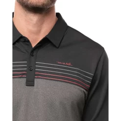 Get a sporty look with the TravisMathew Cainsville Golf Polo. This polo features a signature color-blocked style with chest stripes that will have you looking good on the course. The polo is also moisture wicking and quick drying to pull sweat away and keep you dry and comfortable during your round and its wrinkle resistant trait will have you looking good from the first tee to the last green.