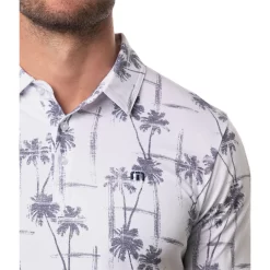 Take your golf style to the next level with the TravisMathew Finally Here Golf Polo. The Finally Here is built with a polyester/spandex blend with an enhanced four-way stretch that will provide supreme comfort throughout the golf swing. There are built-in collar stays that ensure the collar maintains the perfect shape for a stylish look. The allover print with textured palm trees and TM logo on the left chest will have you looking good on and off the golf course.
